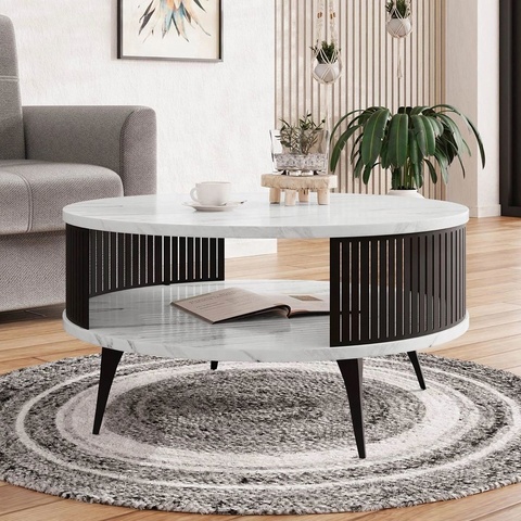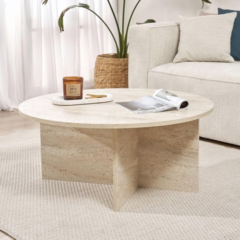 Modern Travertino Pedra Melamina Sala Particle Board Mesa De Café Redonda De Madeira
