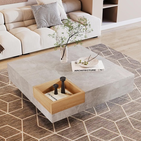 Mesa de Café Quadrada de Concreto Cinza para Sala de Estar com Caixa de Armazenamento Removível